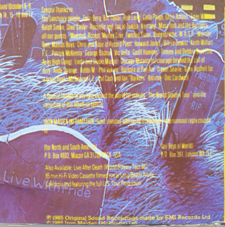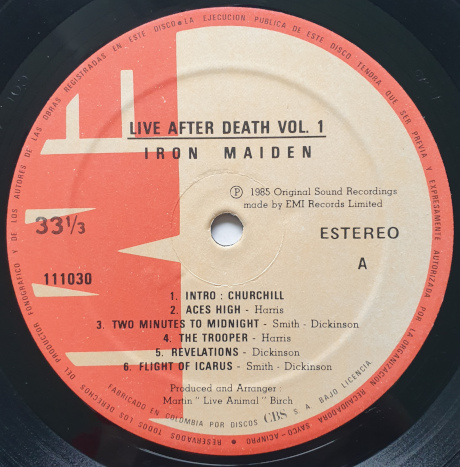Live after death vol 1 printed on label & ( P ) 1985 orginal sound recording.